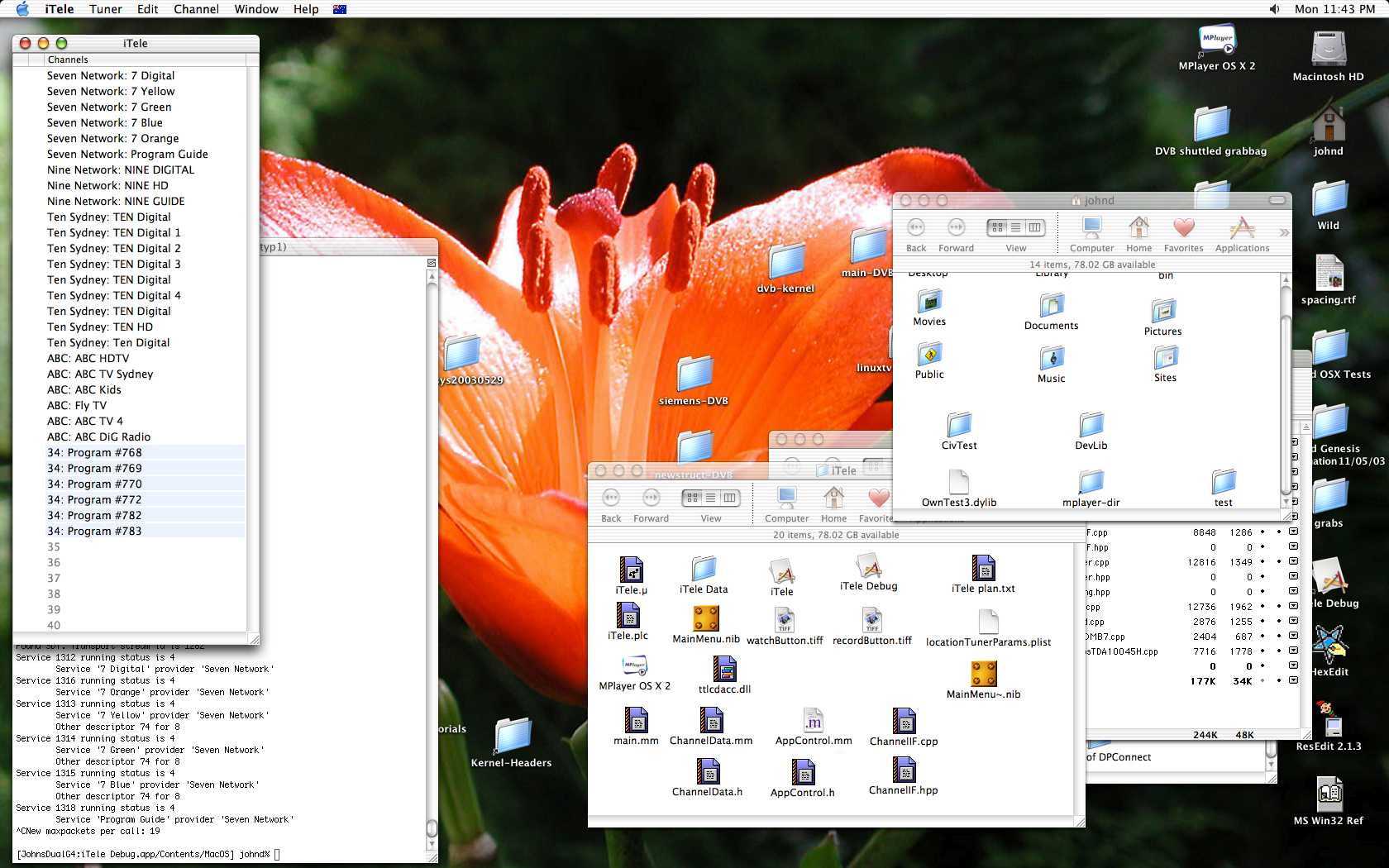 MPlayer has problems playing back 1080i HD channels at full size and speed (e.g. crashes if buffer is over 1024 pixels high). I've now integrated the functionality of MPlayer into iTele, using libavcodec in ffmpeg. You can enable it with the 'Use Internal Display' menu item. Please give me feedback on this option - I know it has problems with some graphics cards.